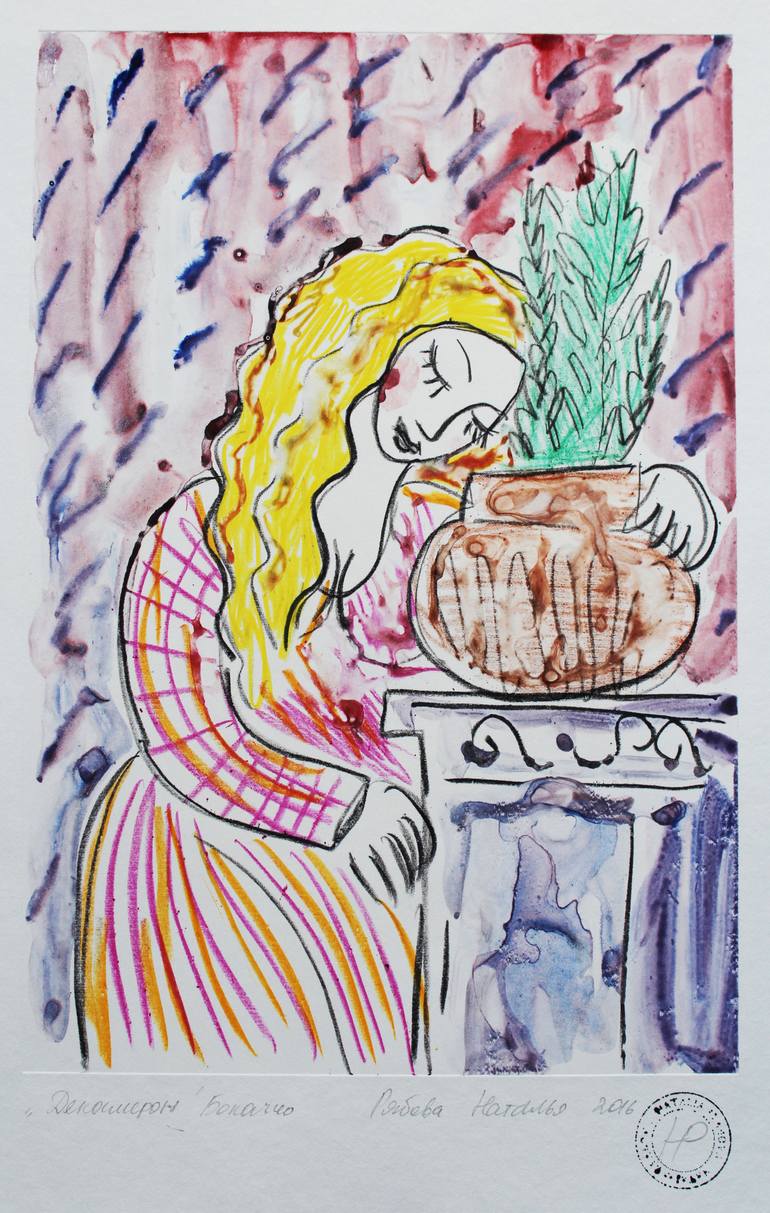 Monoprint on paper. Illustration for "Decameron" Boccaccio. Series was made during summer art residence in Tuscany dear Boccaccio’ house in summer 2016. Intellectual basis of Natalia’ creativity is "the philosophy of unreal» Works indulge in the production of romantic, melancholic and old world i...