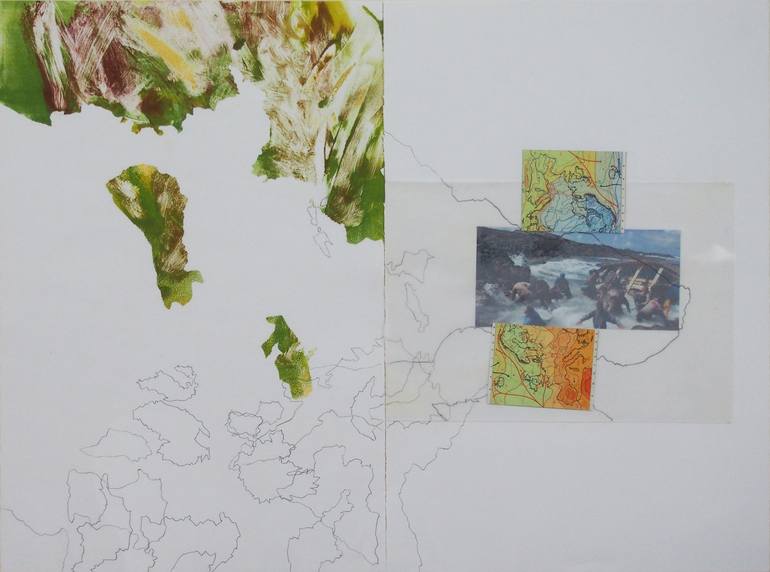 Monotype, drawing and collage on Arches paper. Real or imaginary borders, genuine migrants. I made at first monotypes representing imaginary countries. I then added drawings based on cartography design, and stuck migrants' pictures. Frontières réelles ou imaginaires, migrants véritables. J'ai d'abo...