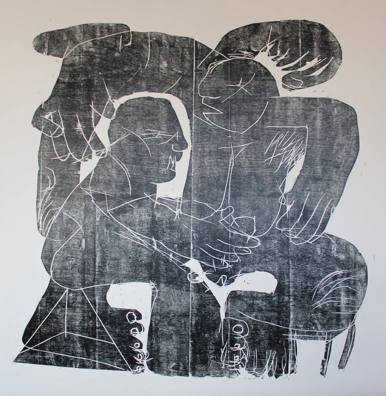 My works are inspired by a very personal perception of situations. I create live sized figures in monochrome colours to reduce myself to what counts and what is necessary. The line is the most important carrier of information and I use my cutting tools for the woodcuts the same way I would use a pencil. When talking about the practical background I stress that I am inspired by sculpturing and I compare woodcut the way I do it as THE printing technique which is closest to three-dimensional art. The subject matter starts from the idea of a knot, where two parts can be combined to a construct in endless ways. The area of the wood for that reason is mostly constant - I also reduce myself in this sense to a defined unit.