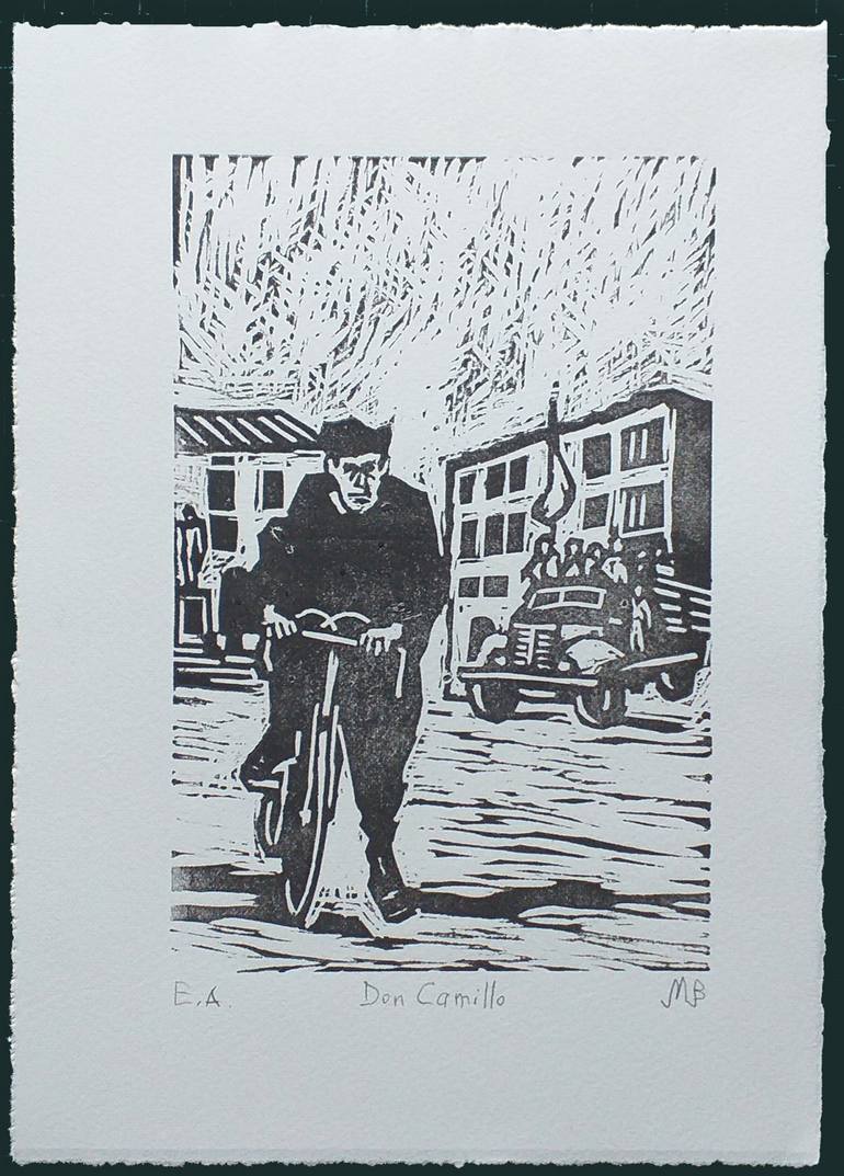 L'image est inspirée du film "Le Petit Monde de Don Camillo" de Julien Duvivier tourné en 1952 à Brescello (province d'Emilie Romagne en Italie du Nord) Il existe 10 exemplaires numérotés de 1 à 10 et 2 épreuve d'artiste. Le lino mesure 18 x 12 cm, il est tiré sur papier Velin d'Arches 180g d'un for...