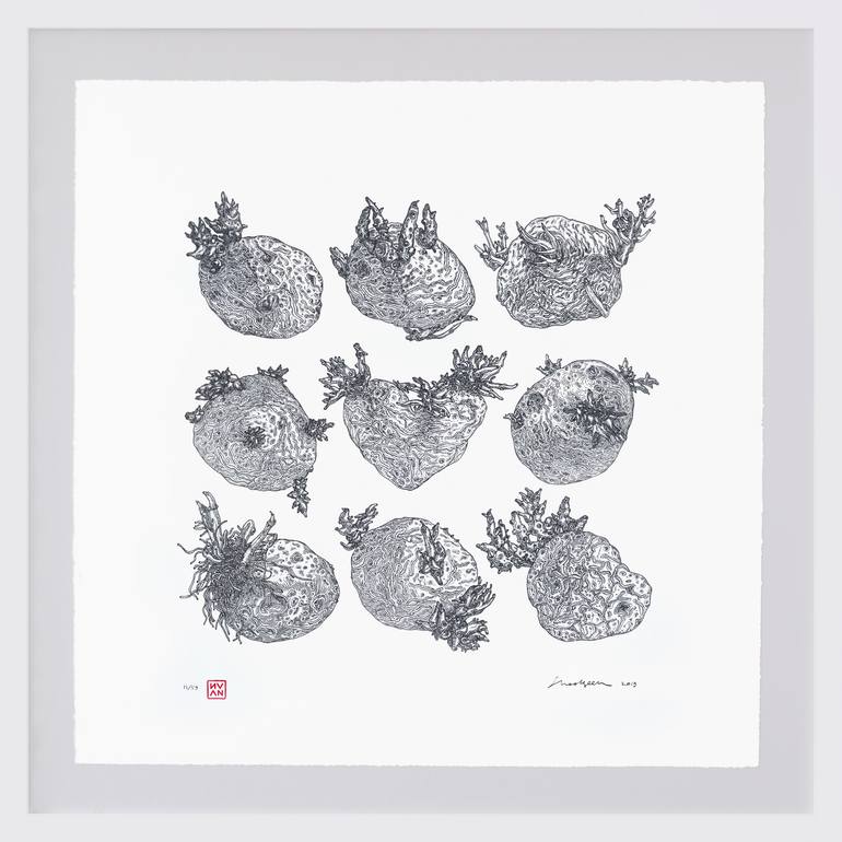 Printmaking: Screenprinting on Paper. "Don't forget your roots. Potatoes" Limited serigraph on 100% cotton paper 200 gsm with hand-deckled edges. 21,6х21,6 inches (55x55 centimeters) Edition of 59, signed and numbered by the artist. This print does not come in a frame and is shipped rolled up in...