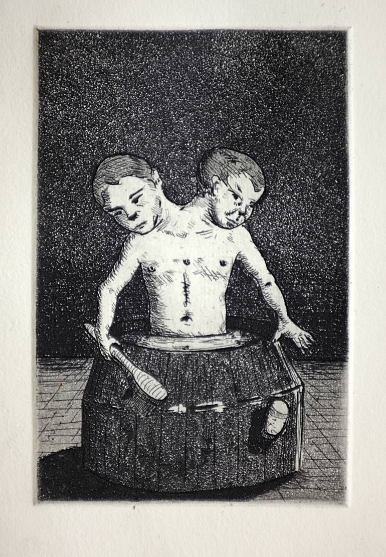 Eduardo Lara Mexico City *1975 He studied Visual Arts at the Faculty of Art and Design of the National Autonomous University of Mexico.  His work includes works in graphics, painting, drawing, sculpture, installation and objects. The theme of his work reflects on the duality and parallelism between life and death, beauty and ugliness, light and darkness, the logical and the absurd. His series of Doppelgänger paintings focuses on the theme of repetition (twins, doubles, alter ego, reflections, copying, repetition, opposite poles) The Blind Men series (painting, engraving, drawing and objects) has as its subject the blindness, in a literal and metaphorical sense, all this from the paradoxical perspective of one who has the privilege of sight. He has participated in more than 60 collective exhibitions, in America and Europe and individually in Mexico, Czech Republic, Spain, Slovakia and Poland. His work is part of public and private collections. In the year 2000 he received the first prize in the graphic contest A modern interpretation of the Ingenious Hidalgo Don Quixote de la Mancha, this work is part of the collection of the Quixote Iconographic Museum in Guanajuato, Mexico; he has also received several honorable mentions in graphic contests around the world. From 2000 to 2002 he founded and coordinated the group of young artists Código Negro, whose mission was the dissemination of the work of artists recently graduated from the Faculty of Arts in cultural spaces in Mexico City. Since 2018, together with the artist Víctor Ríos, he has coordinated the collective of artists and traveling exhibition project Sin Rumbo Fijo, whose purpose is the promotion and dissemination of the graphics of the participating artists who are joining the city project. in city and from country to country, in addition to generating links between artists and institutions related to or dedicated to printmaking. In 2021 he became a member of the Association of Czech Graphic Artists. Since 2003 he has been based in Prague, Czech Republic.