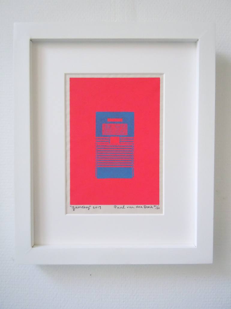 Gameboy nr 21 / 50 Limited series of material prints on linoprint. The backside of a Gameboy was used for printing the image. Showing the serial number and production details of one of Nintendo's first Gameboy's. Printed partially by hand on Japanese paper 29.5 x 21 cm. Limited edition of 50 prin...