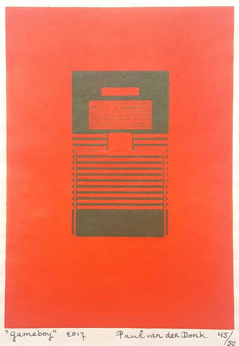 Gameboy nr 45 / 50 Limited series of material prints on linoprint. The backside of a Gameboy was used for printing the image. Showing the serial number and production details of one of Nintendo's first Gameboy's. Printed partially by hand on Japanese paper 29.5 x 21 cm. Limited edition of 50 prin...