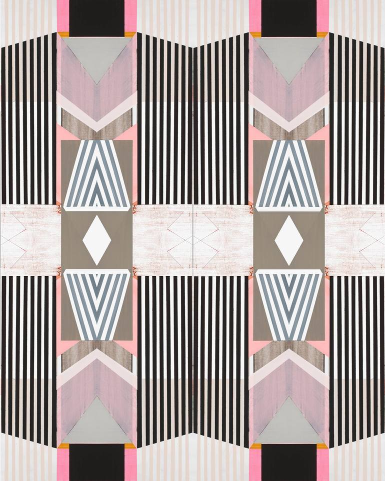 My paintings include hints of two-dimensional icons, stained glass windows, ceremonial objects, carnivalesque paraphernalia, dressmaker pattern pieces, and carefully designed altars. I see the work as functional and as such it may resemble a strange alchemical device, a crude vessel, a protective figure, a fortune teller, a shamanic robe, an asymmetrical mandala…all of which shepherd the process of transformation. I am inspired by the decadence of Art Deco; the hope and efficiency of Mid-Century aesthetics; the joining of texture, light and comfort in interior design; the riotous maximalism in haute couture; the rawness of tribal mark making; and the implied doorway to the unseen in esoteric symbology. All of these influences are cradled in deep investigations into color, particularly its role as a visual phenomenon and catalyst for sparking feeling and narrative. My work is collected worldwide and featured in collections and collaborations in Denver, Seattle, New York City, Macau, Hong Kong, Singapore, Nanjing, Dubai, Edinburgh, and Amsterdam among other places.