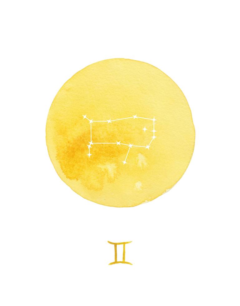 This print is based on the star sign Gemini. The color yellow reflects the sign's cheerful, positive nature. May 21-June 20