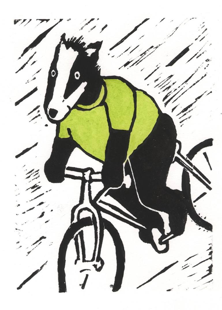 This linocut is handprinted on acid-free paper as a limited edition of 20. This print shows the cycling badger wearing a green jersey as would be worn by the sprint winner at each stage of the Tour de France international cycle race. This edition has been made to meet popular demand, as a similar pr...