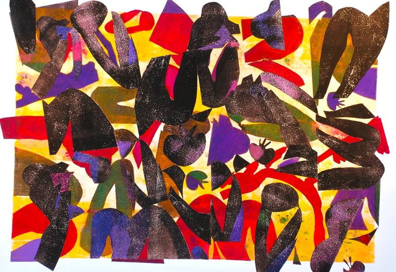 Abstract Collage with graphic shapes. From original mono print on oil ground with cut out shapes, Colored pencil and acrylics. Images are cut outs from Matisse Nude. Limited Edition Print 5/5. Signed and numbered with hand coloring added.