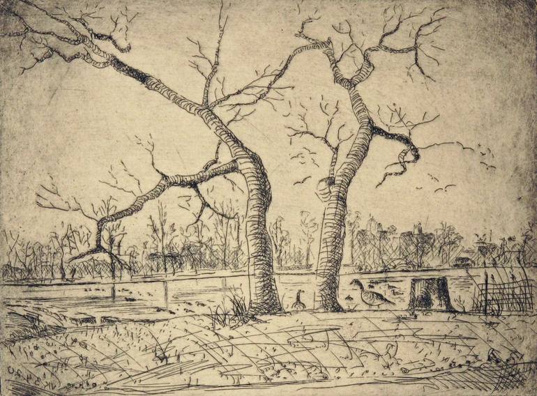 I drew on the hard ground copper plate directly from nature. The Ferric Chloride bitten plate was inked in Graphic Chemical Co. Dark Brown oil-based etching ink and printed on French Rives BFK cream printmaking paper. The prints are pooled from my own Conrad Machine CO. professional etching press. T...