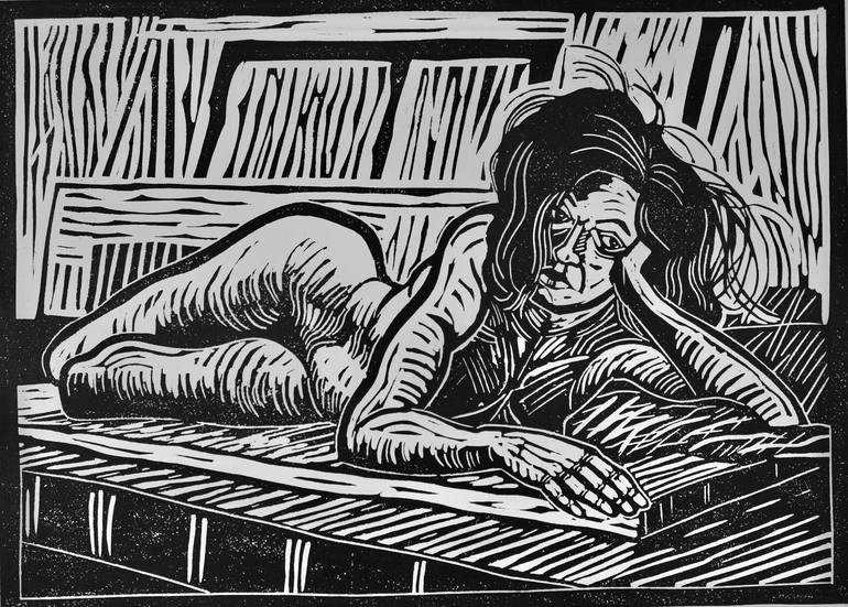 I drew Kristina in different poses and this was the pose I liked the best, so I made it into a linocut. It is printed with one colour (black). It was inspired by German Expressionist artists, who made woodcuts in a similar style.