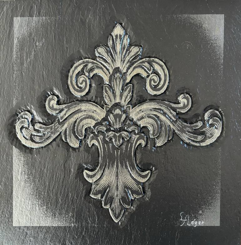 This is a print of scrollwork done on black canvas. Many years ago my father studied classic ornamental architectural design and I was interested in these designs. Most all my artworks are of classic ornamental design which, like my father, I am very interested in producing. My hope is that the piec...