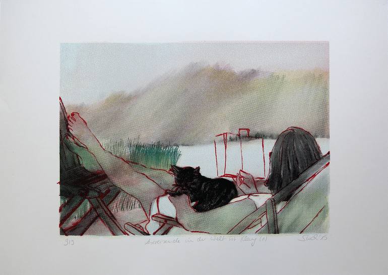 This is a silkprint in the format of 29,7 cm x 42 cm on a 42 cm x 59,4 cm 170 g paper, dorée. Printed with 5 colours/Layers The title means : reading traveller in the world is sound. A really layed back women reading her book with a cat on her womb. This motive makes part of a series of 4 motivs in ...