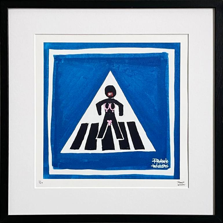 A blue road sign shows a figure with both breasts and a penis on a crosswalk. Gender norms are challenged, familiar symbols playfully subverted, inspired by the push for female figures on traffic signs. A witty take on identity, rules, and visibility. #genderneutral #roadsignart #identity #symbolpl...