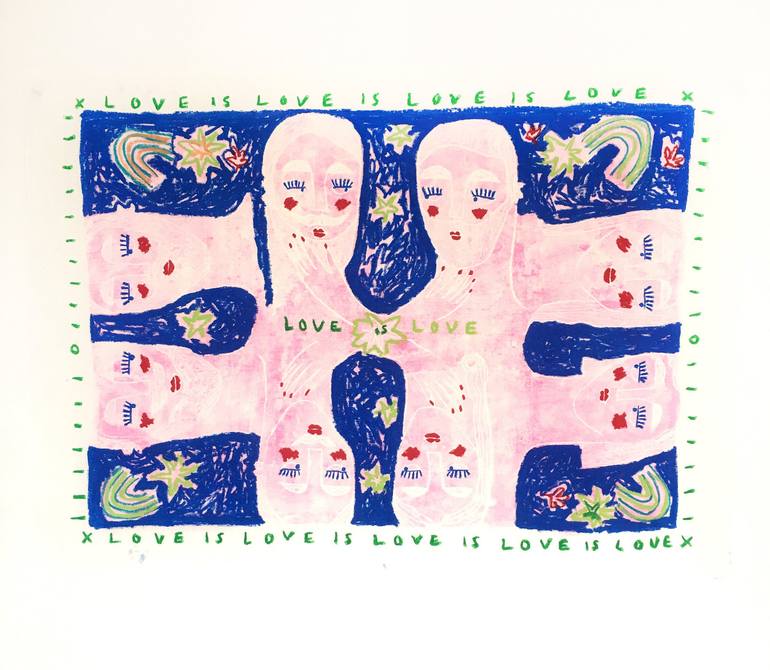 This piece was inspired by a conversation with my brother regarding living as an openly gay man in London. This piece celebrates this love as well as all types of love- be they same sex, platonic, familial. The medium of monotype is very direct - the printmaker is never certain how the print will ...