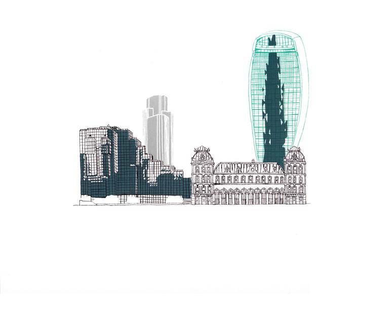 The prints in 'A Walk by the River' series link up to create a set of drawings that flow together along a continuous line but can equally be enjoyed individually. Artist Kethi Copeland has turned her attention to the northbank for the next prints in this series: Old Billingsgate & Walkie-Talkie cap...