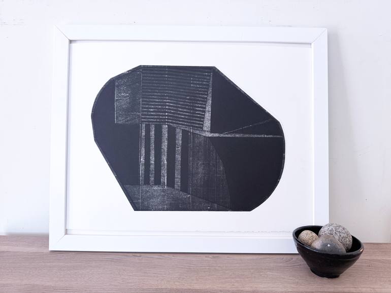"Overlay": This copper plate etching is cut into a shape to create a unique embossment. The background image is created with geometric lines and value shapes that are etched into the surface creating layers of values printed in black. The formal lines create a rhythm of lines and form to create a bo...