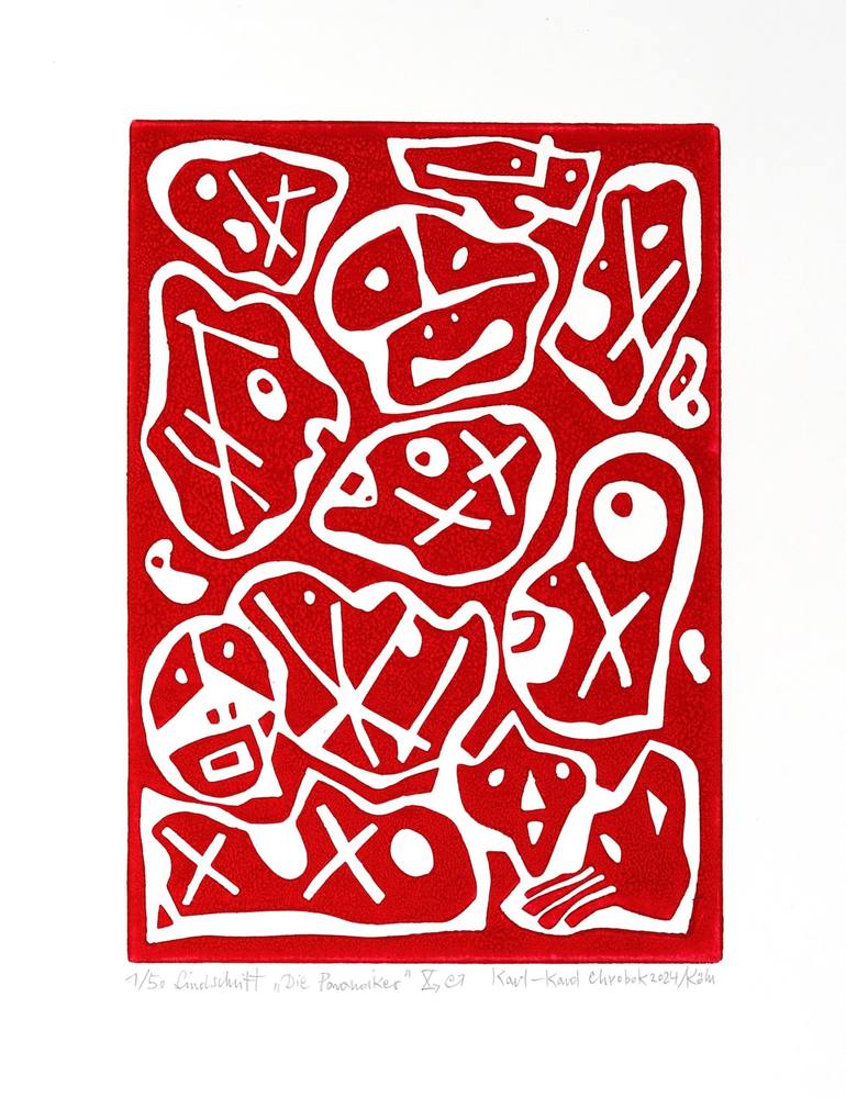 "Paranoiacs" is an expressionistic linocut print on paper depicting distorted faces filled with irony, anger, and a subtle threat. These are portraits of people driven by desire, yet lost in their pursuit, embodying a sense of misguided chaos and lost values. They are aimless, searching for somethin...