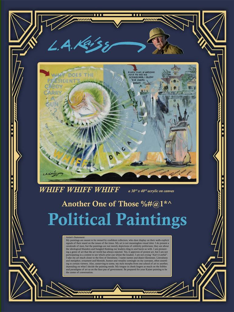 Links to my websites and blogs .kaiser.545 I paint political/editorial paintings. I contend that almost all contemporary art is political, in that they purport to make some point. Thus I assume wide latitude with content and style in my paintings. I reject the usual political paintings with which the collector is familiar. You know, the ones that are obsessed with screaming AIN'T IT AWFUL in some crude visual whine, as if there is a contest to see which artist can be the most hysterical. Comparatively, I have observed that newspaper political cartoonists are far more advanced in use of metaphor, humor, irony and subtleties of tone. More importantly, political cartoonists have the courage and skill to be explicit and precise of point. I am interested in adopting some of the political cartoonist's idioms into fine art. Especially the practice of naming names, confronting specific issues and making the despot the butt of a raucous joke. My paintings are examples of invoking those concerns into contemporary modern painting. It is rewarding and hilariously fun. I hope other artists follow my lead. When I am inclined to give it a name, I call it the Guernica School.