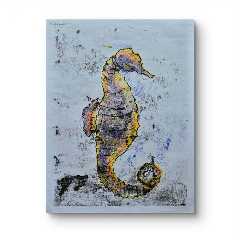 "Seahorse" is a piece that captures the elegance and mystery of a seahorse in its natural habitat. Using a palette of subtle and delicate colors, with predominant blues, yellows, and touches of orange, an image is created that evokes both serenity and majesty. The composition conveys a sense of pe...