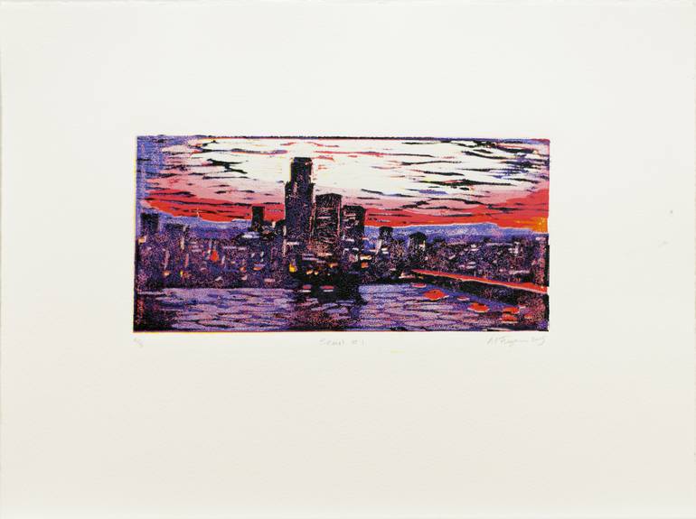 Seoul #1 Edition 2 of 5 Nine color reductive print of the Seoul city skyline, looking over the Han river. This reductive lino-print was hand printed using a baren on to 300gsm archive quality paper with Speedball oil based block printing inks. Print size: 100mm x 200mm Paper size: 260mm x 340mm...
