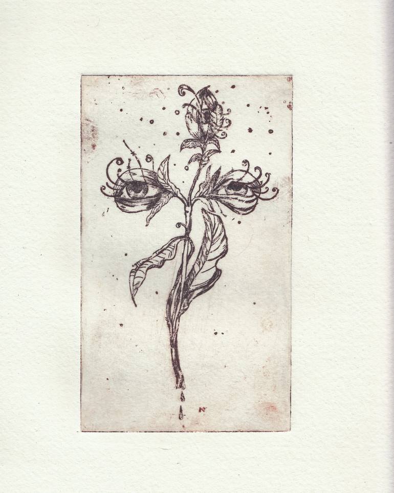 A vision of faith, sacrifice, and surreal beauty, Saint Lucy Lilies is an etching inspired by the story of Saint Lucy, the patron saint of sight, often depicted holding her own eyes as a symbol of divine vision beyond the physical. In this piece, human perception merges with nature—eyes bloom from t...