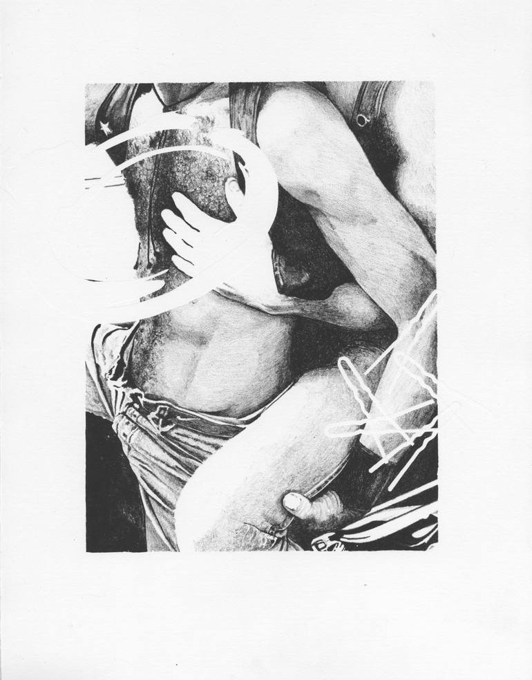 Lithograph of gay men embracing one another with knock out stencils used to emboss print.