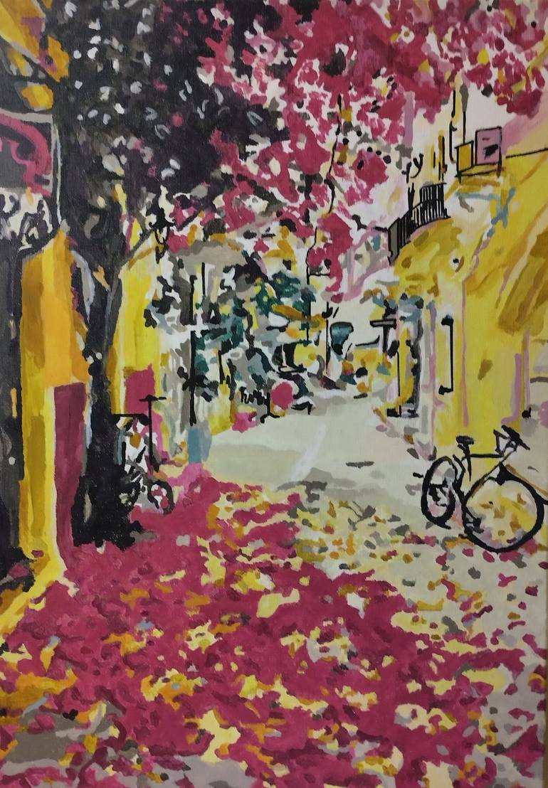 The painting "Streets of Italy" in autumn captivates with the bright red and yellow shades of fallen leaves. Cozy streets framed by ancient architecture create an atmosphere of warmth and comfort, immersing the viewer in the romance of the Italian autumn landscape.