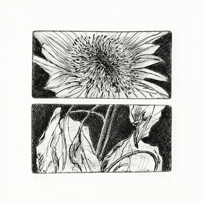 Title: Sunflower Technics: etching and aquatint Size: plates 14 x 7 cm x 2, paper 20,5 x 21 cm Hand-printed on Fabriano Rosaspina 285 g/m2 Edition: 6 copies Signed and numbered on the front Some variation can occur, which makes each print unique