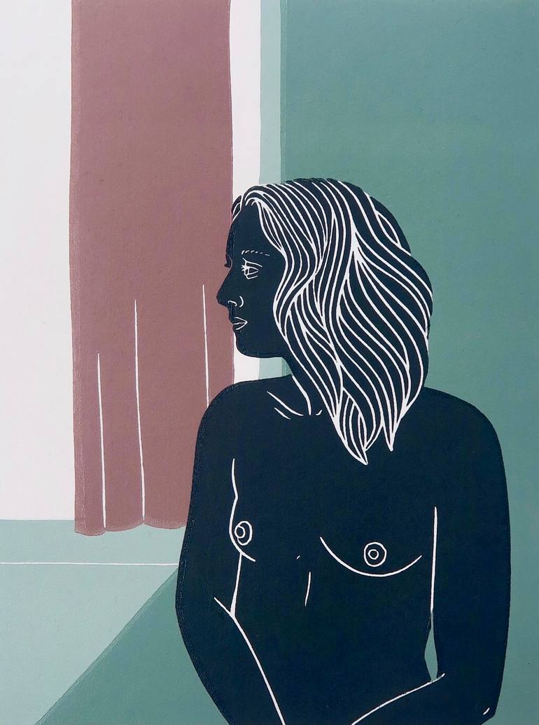 I am a London based printmaker and painter. My work speaks to the sensitive among us. Those who experience intensely, who are overcome by beauty, who are overwhelmed by the rush and loudness of our world, and who wish to linger more fully in the present. Our gift is knowing that the present moment holds all we need, and that by speeding through it we miss everything. We are the deep feelers and seers of the world. The more we learn to enter into this realm of quiet the more richness we are able to perceive. I express this sensitivity through the subject of the nude, more specifically my own nude body. Though I don’t see my images as self-portraits, but rather vessels for lived experience. My hope is that the viewer can sense themselves within the image. Each pose is chosen carefully to communicate something about the interior world of the figure, whether it be vulnerability, deep presence, strength, or something else entirely. What they have in common is the deep awareness of an inner state. I felt throughout my life that my sensitivity and my need to take things slowly were things to be overcome. Through my work I discovered that these were not my failings but rather the place from which I found a voice. Though often challenging, there is gold within this way of being. We learn to see ourselves, our environment, and others much more clearly. I’m drawn to works on paper for the softness that I often find in them. I originally fell in love with linocut during my studies in modern art. I was drawn to the restriction that is inherent within it. As an image is carved and layered using different blocks, the artist must be very deliberate about details, as anything extra could become much more technically complex. This naturally allows for pieces ruled by simple lines and forms. Linocut also sits at the border between art and craft, which offers intimacy to the image. Eight years into my artistic career I added gouache painting to my practice as a way to explore more detail while maintaining the minimalism and delicateness of my print-works. larger colour fields. At the same time my study of art history has come to influence my images. Observation of Japanese ukiyo-e woodblock prints has informed the way I compose my figures, while the silhouettes of ancient Greek pottery have inspired the tendency to define my nudes using gentle contour against solid tone.