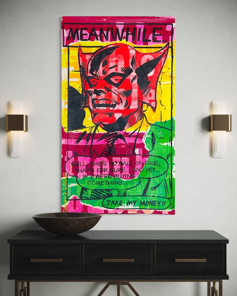 Layering collage - Mix match of dramatic Masculine and Monster energy and imagery. Stemming from comic roots with a splash of humour. Intended to pop off the wall.