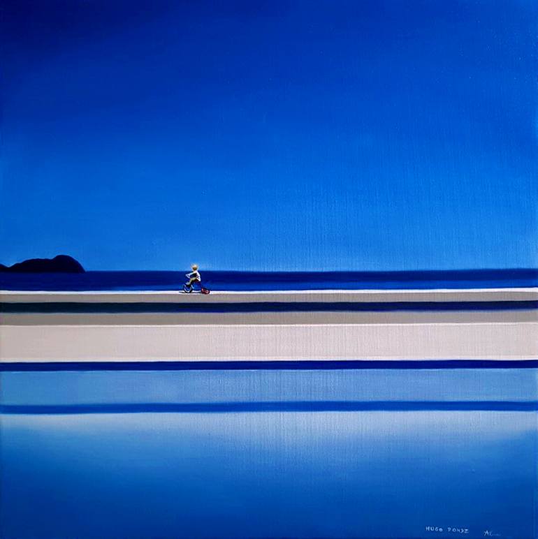 This is a mixed media of the original. Its print on a canvas and comes varnished by hand. Only 10 Copies. Even if there are 10 copies, each is an ''original'' because of the oil glaze. This work will be shipped rolled in a secure tube. A young boy gazing at the sea while biking on a wall...
