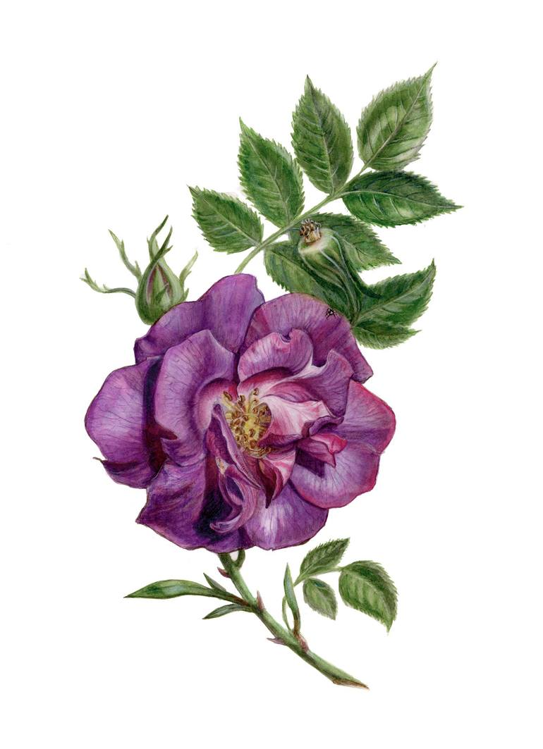 Title: "The Rose "Blue Rapsody" Collection: Botanical Executed: 2021 Note: signed at front and reverse labeled Medium: Paper, ink Carrier: strong tube Frame: not framed Cm: 30w/40h/0,3d Inch: 11,8w/15,8h/0,1d * Authentication: The painting is titled and signed on the back and also comes with an...