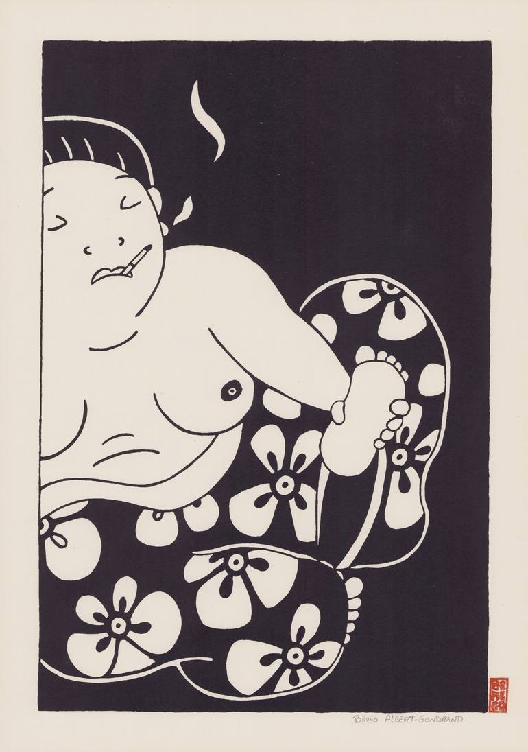 Tokyo Downtown Beauty: "Shitamachi no Bijin". Far from the crowded and trendy places of the big city there is another Tokyo. There, one may mess with his feet, have a smoke, and still remain gracious and elegant. Homemade silk screen on Japanese paper "shinbafun". 2018. Limited edition: 20. Numbere...