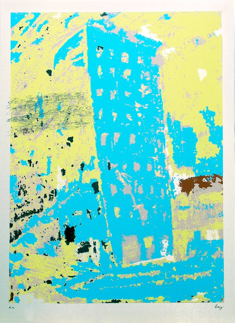 The graphic “Tower - pink” was created based on the motif of a real multi-story high-rise building using screen printing technology, also known as through-printing. Color areas of the painting were separated during the preparation of the print and combined into seven color spaces. A sieve created i...