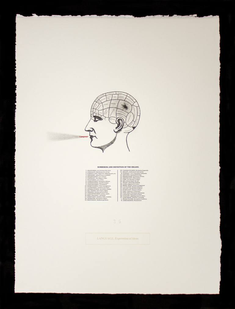 I am interested in the classification that phrenology made of the brain areas related to emotions and feelings. I use several techniques to achieve the result I want: graphite, screen printing, and laser to engrave the paper