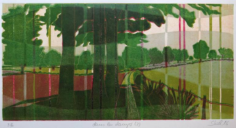 woodcut, five coulours (five woods each one cutted by hand), 25 cm x 50 cm printing surface, on paper Dorée 50 cm x 70 cm, 2016 the landscape is a view in France in the region Berry, where I work in my summerstudio