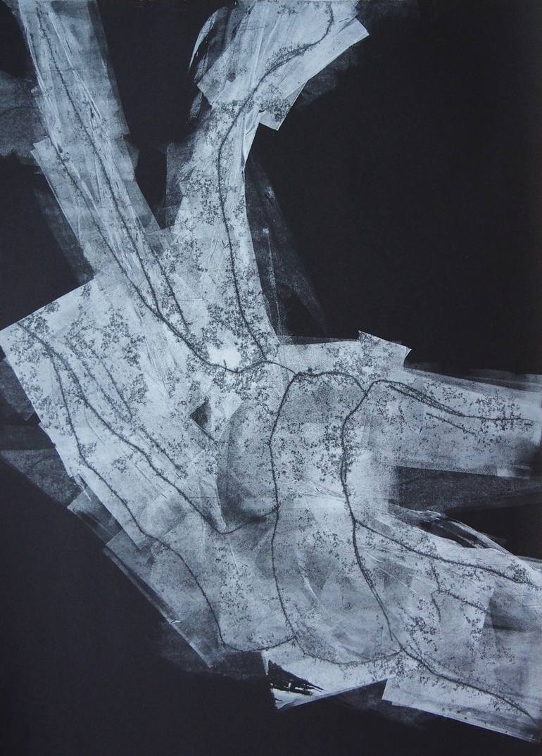 While working on the series Anatomy, which concerned rather flesh and liquids of the body, I wanted to represent bones and nervous system. I used black paper and white print ink, creating pictures kind of artisanal X ray.