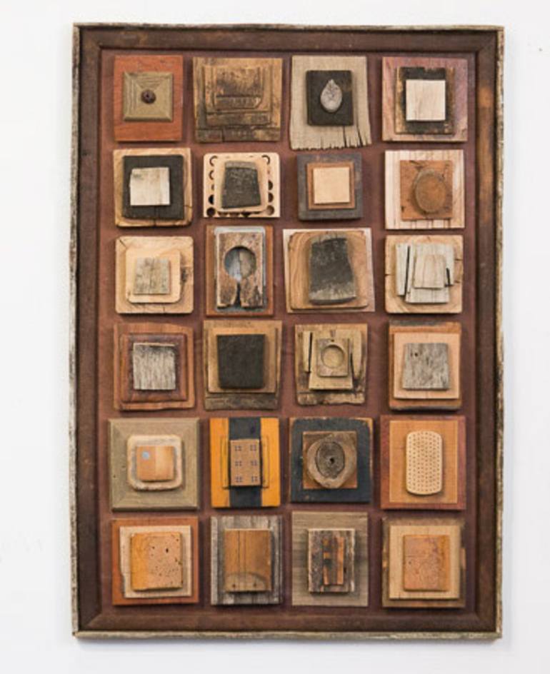 This piece is a combination of found wooden oddities in an arrangement that melds their colors and shapes in a pattern that I hope viewers will enjoy as much as I do and be drawn back to look at it repeatedly. The background is leather over wood and it comes with hanging hardware.