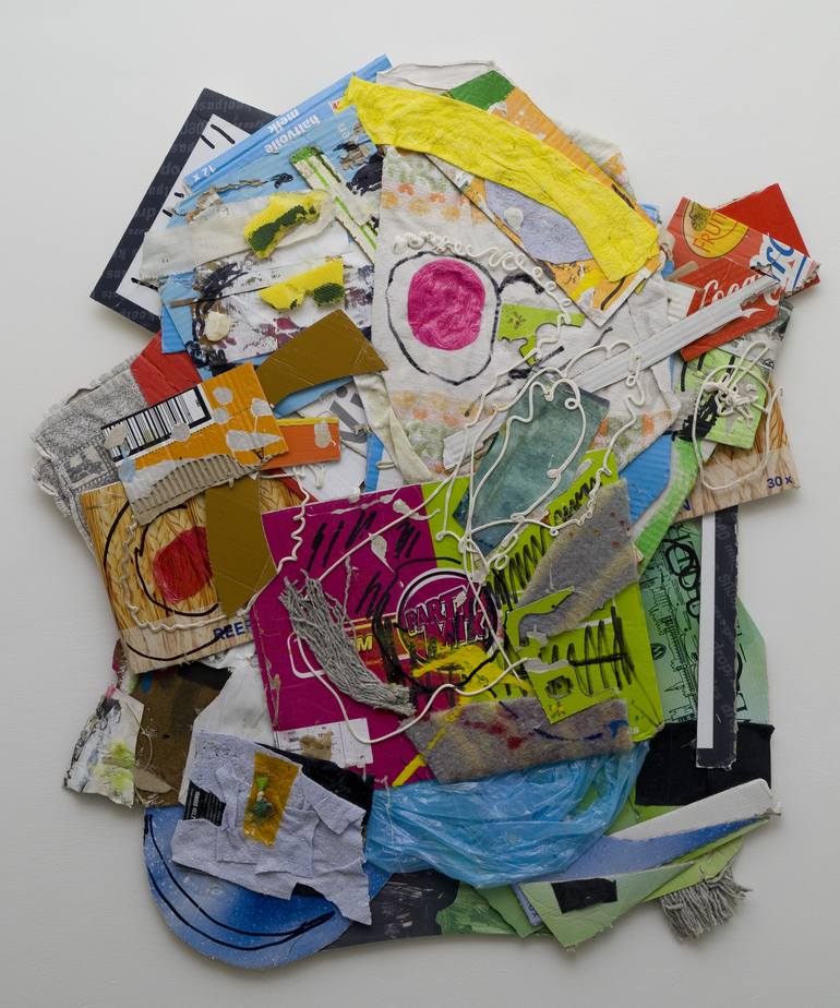 Collagepainting. Fabric, cardboard box, acrylic, canvas, foil, foam, marker, mop, candy wrappers, textile on cardboard.