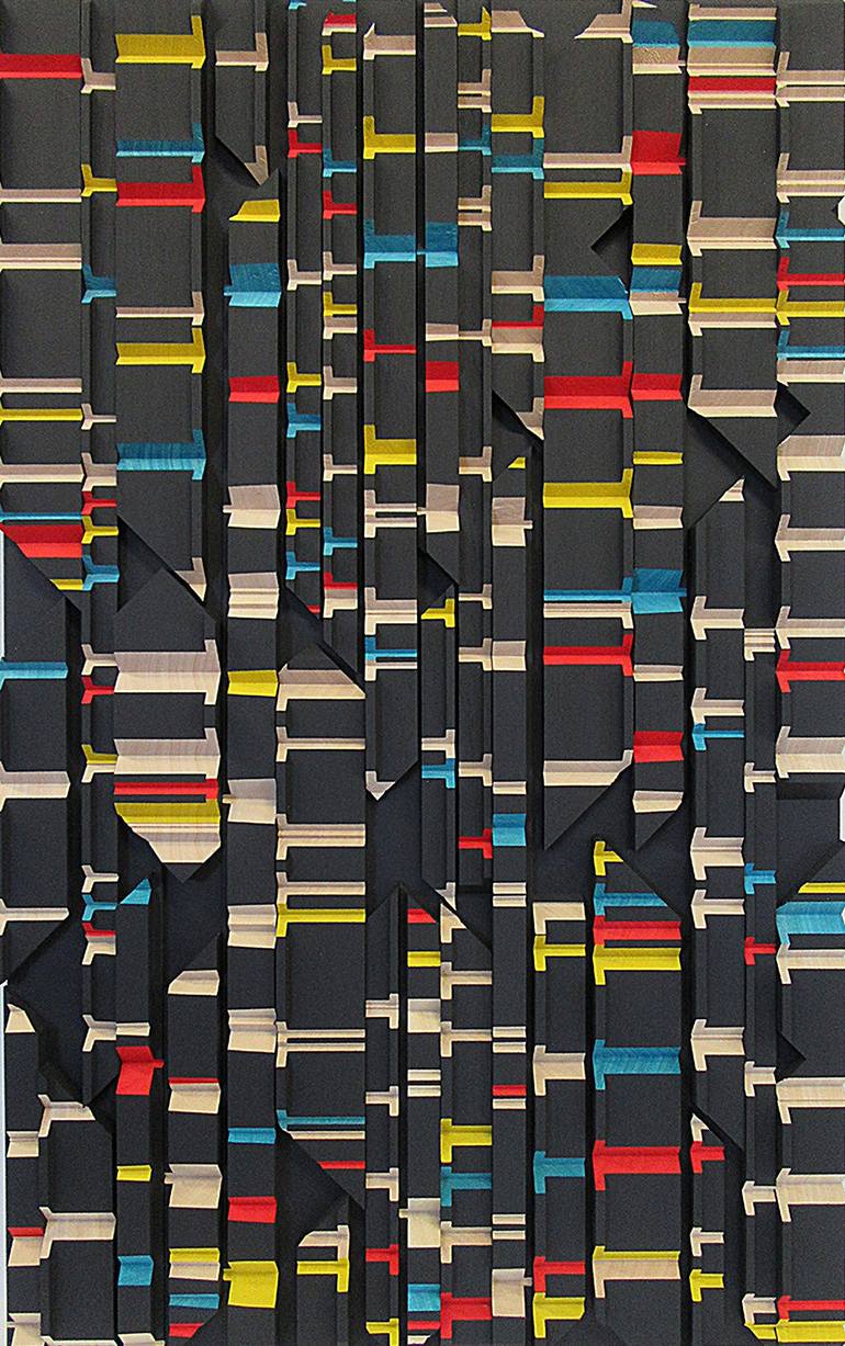 Frank Murri (Australia) The nature of my art practice consists of wall-hung, abstract timber relief sculptural works. These pieces are formed by incorporating Mathematical formulas, theorems & sequences; Musical scores & Literary extracts. It is an art form which I have developed, and which I hope one sees as a unique creation. All of my works advocate pure abstraction in an attempt to synthesize a design aesthetic. By looking into the realm of pure mathematics, there lies within a beauty which transcends its usual form. As Bertrand Russell stated, “Mathematics, rightly viewed, possesses not only truth, but supreme beauty — a beauty cold and austere, like that of sculpture.” The Mathematical pieces I create are formulated to capture this beauty. ~*~ In addition to my Mathematical art pieces, I have also created abstract representations of Musical scores as wall-hung timber relief sculptural pieces. They represent the first page of sheet music of particular classical works, in particular: Puccini's 'Vissi dárte' (I lived for art) from Tosca; Verdi's 'Grand March from Aida'; Schubert's 'Ave Maria, Op.52, No. 6'; Korsakov's 'The Flight of the Bumble-Bee' and Albinoni's 'Adagio'. Each sculptural piece has the notation of sheet music represented through carvings into the timber staves (also known as staffs), or notes on outer ledger lines. Please note that my pieces are pure abstractions of musical scores, as I have not used the usual and specific music symbols and elements. They have not been created as direct representations to be performed. I have created these sculptural pieces as an artistic expression of the beauty I see held in the musical score (itself a wonderful abstraction and code of notes and symbols) which represent such beautiful pieces of music. ~*~ In addition to the Mathematical & Musical art pieces, I have also created abstract representations of Literary extracts as wall-hung timber relief sculptural pieces. Each segment is carved in a particular sequence representing a specific literary work. The spacing between each carving represents a letter of those words in the piece. ie, the letter “A” = 1mm, whilst “Z” = 26mm spacing.