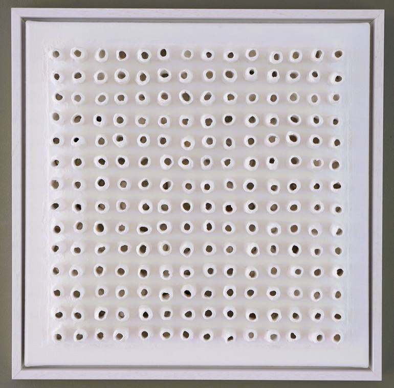 White relief, painted paper mache on a plain canvas base, captured in a white wooden frame. The repetitive composition is made of 196, hand made, paper mache tubes. Fixed on canvas using paper mache pulp, finished by white paint. While the tubes seem alike from a distance, at close observation it’s...