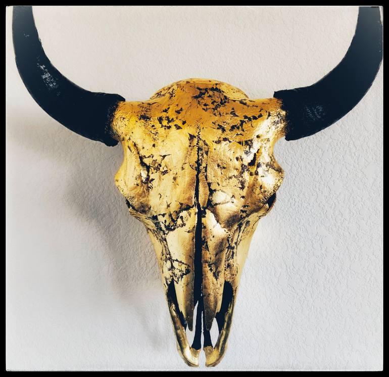 Buffalo Skull – 24K Gold Leafed Large Buffalo #1 This large, real male Buffalo skull is gilded by hand with authentic 24 kt Gold Leaf from Thailand,. The horns are painted a brilliant gloss black. 25” tall x 26” wide x 11” deep