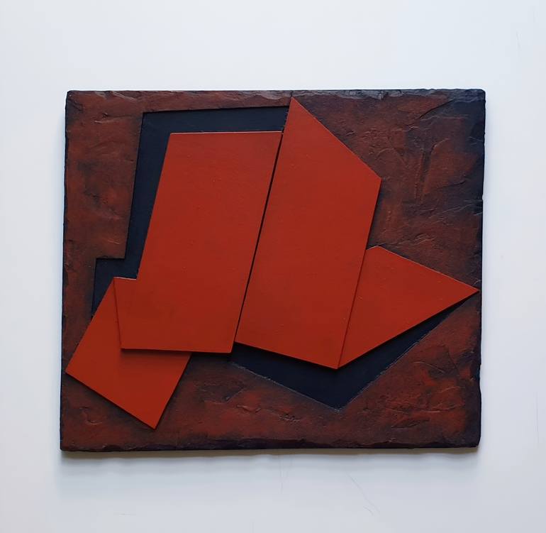 The artwork is a minimalist composition featuring overlapping geometric shapes. The entire piece focused on creating subtle spacial shadows and depth through raised panels and seemingly natural textures and deep earthtones. The texture of the material used, gives it a tactile quality. Overall, the a...