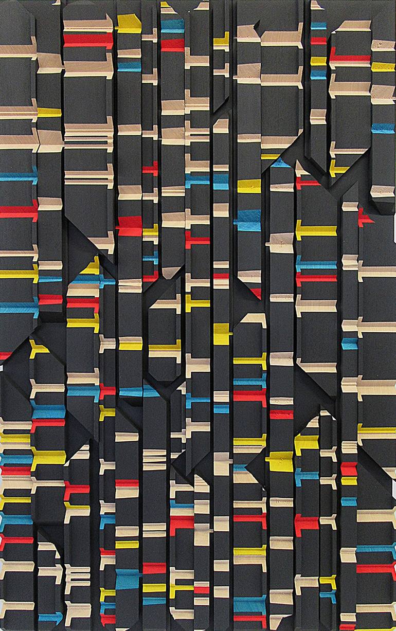 Frank Murri (Australia) The nature of my art practice consists of wall-hung, abstract timber relief sculptural works. These pieces are formed by incorporating Mathematical formulas, theorems & sequences; Musical scores & Literary extracts. It is an art form which I have developed, and which I hope one sees as a unique creation. All of my works advocate pure abstraction in an attempt to synthesize a design aesthetic. By looking into the realm of pure mathematics, there lies within a beauty which transcends its usual form. As Bertrand Russell stated, “Mathematics, rightly viewed, possesses not only truth, but supreme beauty — a beauty cold and austere, like that of sculpture.” The Mathematical pieces I create are formulated to capture this beauty. ~*~ In addition to my Mathematical art pieces, I have also created abstract representations of Musical scores as wall-hung timber relief sculptural pieces. They represent the first page of sheet music of particular classical works, in particular: Puccini's 'Vissi dárte' (I lived for art) from Tosca; Verdi's 'Grand March from Aida'; Schubert's 'Ave Maria, Op.52, No. 6'; Korsakov's 'The Flight of the Bumble-Bee' and Albinoni's 'Adagio'. Each sculptural piece has the notation of sheet music represented through carvings into the timber staves (also known as staffs), or notes on outer ledger lines. Please note that my pieces are pure abstractions of musical scores, as I have not used the usual and specific music symbols and elements. They have not been created as direct representations to be performed. I have created these sculptural pieces as an artistic expression of the beauty I see held in the musical score (itself a wonderful abstraction and code of notes and symbols) which represent such beautiful pieces of music. ~*~ In addition to the Mathematical & Musical art pieces, I have also created abstract representations of Literary extracts as wall-hung timber relief sculptural pieces. Each segment is carved in a particular sequence representing a specific literary work. The spacing between each carving represents a letter of those words in the piece. ie, the letter “A” = 1mm, whilst “Z” = 26mm spacing.