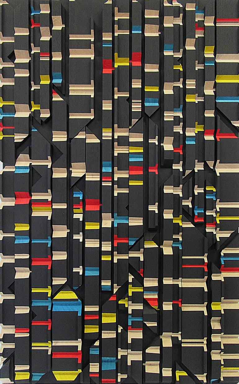 Frank Murri (Australia) The nature of my art practice consists of wall-hung, abstract timber relief sculptural works. These pieces are formed by incorporating Mathematical formulas, theorems & sequences; Musical scores & Literary extracts. It is an art form which I have developed, and which I hope one sees as a unique creation. All of my works advocate pure abstraction in an attempt to synthesize a design aesthetic. By looking into the realm of pure mathematics, there lies within a beauty which transcends its usual form. As Bertrand Russell stated, “Mathematics, rightly viewed, possesses not only truth, but supreme beauty — a beauty cold and austere, like that of sculpture.” The Mathematical pieces I create are formulated to capture this beauty. ~*~ In addition to my Mathematical art pieces, I have also created abstract representations of Musical scores as wall-hung timber relief sculptural pieces. They represent the first page of sheet music of particular classical works, in particular: Puccini's 'Vissi dárte' (I lived for art) from Tosca; Verdi's 'Grand March from Aida'; Schubert's 'Ave Maria, Op.52, No. 6'; Korsakov's 'The Flight of the Bumble-Bee' and Albinoni's 'Adagio'. Each sculptural piece has the notation of sheet music represented through carvings into the timber staves (also known as staffs), or notes on outer ledger lines. Please note that my pieces are pure abstractions of musical scores, as I have not used the usual and specific music symbols and elements. They have not been created as direct representations to be performed. I have created these sculptural pieces as an artistic expression of the beauty I see held in the musical score (itself a wonderful abstraction and code of notes and symbols) which represent such beautiful pieces of music. ~*~ In addition to the Mathematical & Musical art pieces, I have also created abstract representations of Literary extracts as wall-hung timber relief sculptural pieces. Each segment is carved in a particular sequence representing a specific literary work. The spacing between each carving represents a letter of those words in the piece. ie, the letter “A” = 1mm, whilst “Z” = 26mm spacing.