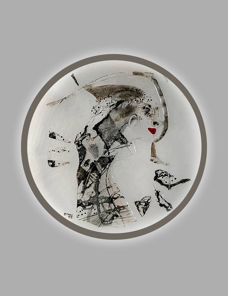 Glass on glass painting fired in the kiln, in steel frame with the descrete LED light on the back