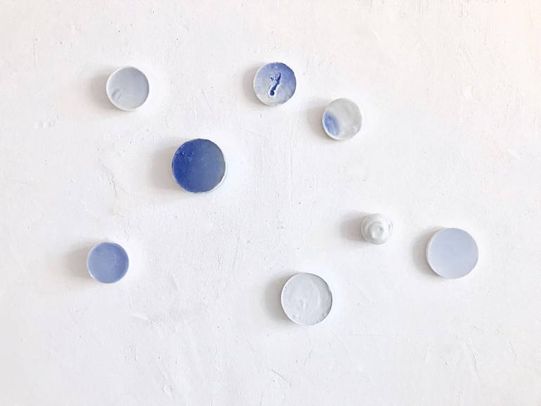 This is an installation of Moonstones in different shades of blue. Sometimes in the evening before sunset the sky has this intense color which I love. I made each sculpture by pouring plaster into molds and either mixing blue paint in with the plaster or using a glossy blue finish. In the back is a ...
