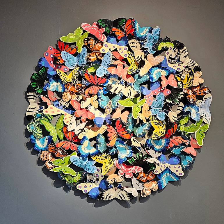 The relief is inspired by the beauty of nature. Iron butterflies, welded together in a circular composition. Commissioned art is available with colours or size preferred by the client.