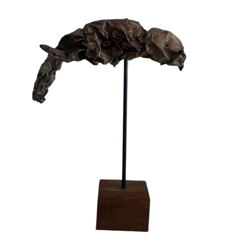 Scraps of metal or tin has been crumpled to create this beautiful piece. It is polished to bring about a shine. The creativity of the artist is portrayed through this creation. The image is different when observing from another angle. The beak, the tail, every detail has been carefully created. A sc...