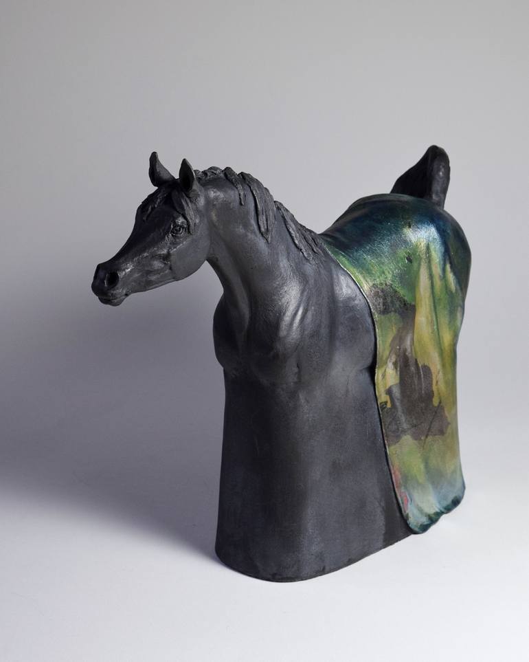 A Bedouin legend says that God created the Arabian horse from a handful of South wind. The metallic glaze really contrasts the carbon black unglazed areas. Note: This piece has a hairline crack caused by the extreme temperature changes of firing. The crack does not affect the structural integrity...
